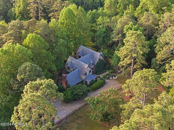 This stunning equestrian estate brings an air of old world craftmanship to our modern day. The home was built in 2007 to look like an 18th century European mansion. Every detail has a special story that integrates pieces of family history with old world charm. As you walk through the exquisite handmade front door, you are greeted with a pure silver chandelier and sconces that are family heirlooms. The flooring throughout the home is wide plank and a combination of pine, walnut and oak. The stairs that lead to the second floor are purported to be from Dartmouth College. The fireplace in the family room is an 18th century replica of a Chatsworth House in England. The fireplace in the library boasts 18th century French marble. The hardware on doors and windows are antique, many from the 17th and 18th century. Diamond pain and stained glass windows were reclaimed from historic properties. The spacious primary suite is on the second floor and boasts his and hers closets and large bathroom with soaking tub. The sitting room with a surround of windows, gives you the feeling that you are sitting in the forest enjoying all that nature has to share. The kitchen is a chefs dream with a 6 burner Viking range, large center island and a butler's pantry. The property is just over 10 acres and includes three lush pastures and a 4 stall barn with center aisle. The barn has a one bedroom apartment upstairs and a studio apartment downstairs, perfect for guests or a farm manager. The Walter Moss Foundation and the trails around Weymouth Woods are a short hack. The location of this property is fantastic, offering seclusion in the heart of horse country, while being only a few minutes to all that downtown Southern Pines has to offer.