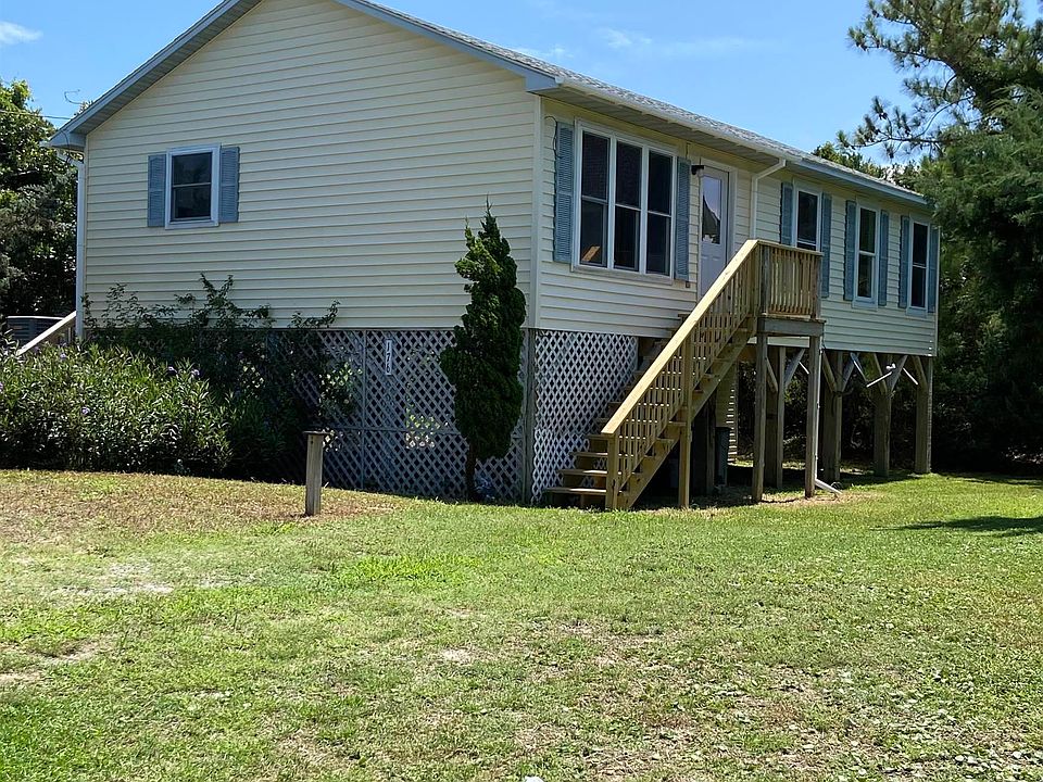 This simple floor plan offers 3 bedrooms, each with good sized closets, and one full bath with a soaking tub and oversized corner shower. The interior has been freshly painted. The roof is a one year old fortified roof. The large eat-in kitchen was just upgraded with new cabinets and countertop. A slider off the kitchen takes you to a side deck and outside shower. Additionally, there is a laundry room, kitchen pantry, hallway linen closet, coat closet at the front door entry and a shed under the house. The 3 large living room windows make that area sunny and bright. A great starter home on the island!