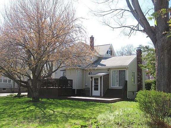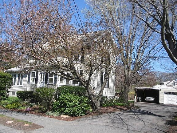 MOVE IN and enjoy this well maintained home with two car garage and deck overlooking 12,090 sq ft level lot in private setting with patio area aside the shade of mature maple, blossoms and floriferous perennials. Renovated kitchen (2013) and many more updates include bathroom, roof and decks. Three bedrooms upstairs with optional guest bedroom/home office on first floor. Front porch opens to Interior offering period detail warmth of natural woodwork and exposed brick with high ceilings, hardwood floors throughout embracing the sunny spacious cathedral ceiling living room with slider to backyard and deck area. Walk up unfinished attic and partially finished basement area with walkout and sink/cabinet/counter, storage room and laundry area. Close proximity to major highways, bus/commuter rail, shops, parks and restaurants, movie theaters, bike/walking paths. Lots of space to grow into this perfect home!