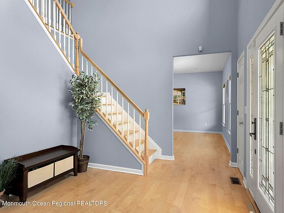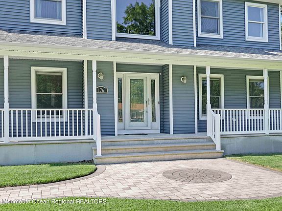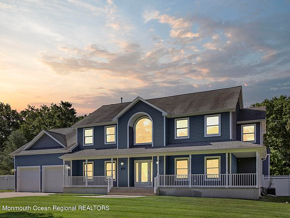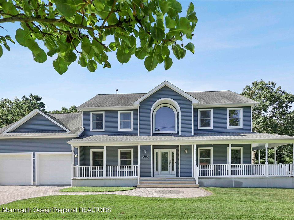 Boasting awe-inspiring curb appeal in an ultra-private location, this 5-bedroom, 2.5-bathroom Custom Colonial is set upon nearly a half-acre within a tremendous family neighborhood. Abutting acres upon acres of woodlands yet still a stone's throw away from the finest beaches at the NJ Shore, few opportunities present such versatility and function both inside and out. Meticulously laid hardscapes span the home's front exterior, including a double-wide paver driveway, walkways, and an expansive wrap-around porch ideal for northeastern-facing morning sunrises. A two-story foyer introduces the interior's main level, where maple flooring runs throughout. Spaces include a living/bonus room upon entry, with an elegant formal dining room positioned opposite the foyer, offering convenient access to a gorgeous eat-in kitchen with breakfast bar, dinette, stainless steel appliance package and granite countertops. Adjacent to the kitchen resides a large family room, equipped with a gas fireplace and views overlooking the resort-like backyard. A powder room, designated laundry room and direct access to the attached 2-car garage complete the main level. The upper level hosts all five (5) bedrooms and two additional bathrooms, including a massive primary suite with vaulted ceilings and spa-like ensuite with dual sinks, oversized jacuzzi tub and large shower stall. Descend into the full, finished basement for privacy or recreation, set upon luxury Pergo flooring and featuring an open-concept layout. Step outside and into your fully fenced-in backyard oasis, comprising tons of level lawn space, an expansive patio and hallmarked by an in-ground, free-form pool. Powered by solar for maximum efficiency, and conveniently located near the finest things eastern Ocean County has to offer. A MUST SEE!