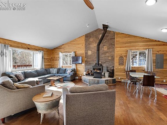 Embrace the beauty of true Colorado living in this one-of-a-kind log-sided home, nestled among towering trees and offering stunning valley views. Privacy abounds as you relax on the spacious deck, perfect for al fresco dining or simply soaking in the peace and tranquility of nature. Whether it's the vibrant daytime landscape or the star-filled sky at night, the views here are truly breathtaking. Inside, the cozy yet inviting great room exudes warmth, featuring tongue-and-groove walls and a charming wood-burning stove. The dining area flows effortlessly into a kitchen equipped with sleek stainless-steel appliances and tile countertops. Two inviting bedrooms offer just the right amount of space for restful nights, separated by a full bathroom. Convenient laundry hookups are ready for a stackable washer and dryer. The lower level is a blank canvas with immense potential, ready to be customized to your needs—whether that's a family room, extra bedrooms, or even another bathroom. The poured concrete floors are prepped for your personal touch, with a rough-in for a future bathroom already in place. Located just a short drive from Divide and Cripple Creek, you’re close enough to local shops, restaurants, and outdoor activities, yet far enough to enjoy complete privacy and peace. With a new metal roof installed in 2023 and the groundwork laid for future expansion, this home is ready for you to move in and make it your own. Don’t miss your chance to own this mountain gem!