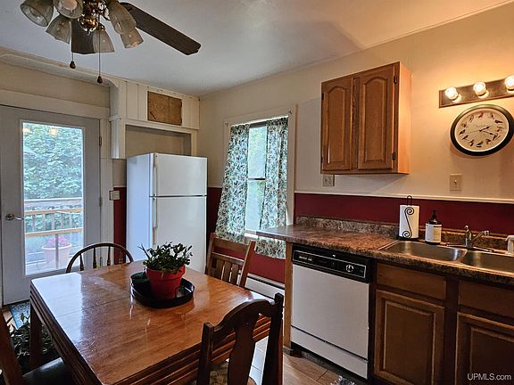 Nicely updated and attractively remodeled. Main floor has a spacious living room and a large, eat-in kitchen with laundry area. Kitchen opens to living room with a breakfast bar made from a repurposed pew. Efficiently designed kitchen has appealing cabinetry that matches the antique table and chairs. Upstairs are two generously-sized bedrooms and a full bath. The clean and dry basement has decent headroom and a workshop bench. Outdoor access from basement. 100-amp electric service. House has all newer windows. Floors downstairs are vinyl plank. Upstairs you’ll find hard wood and wood plank floors. A small deck overlooks the back yard. Low-maintenance yard may be small but has many lovely garden areas. Compost bin will stay. All contents in house will stay. Home is within walking distance to the park and lake, downtown, restaurants and shopping. This information has been secured from sources we believe to be reliable, but we make no representation or warranties, expressed or implied, as to the accuracy of the information. References to square footage, lot size /dimensions, and age are approximate. Buyer must verify the information and bears all risk for inaccuracies. Taxes will change upon the sale of the property. Contact the Village of Lake Linden Assessor for tax information.