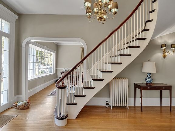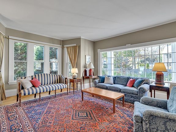 Be part of a coveted Spy Pond's waterfront neighborhood in this 4+ BR gracious and roomy home.. Easy access via Chapman St to driveway/pking. Views of pond and lovely homes nearby. Exterior is graced by a lovely 4 pillared portico with a mature garden/yard on front side. Great light streams through oversized windows. The foyer is distinguished by a sweeping curved stairwell with generously sized LR and DR on both sides, each with handsome marble fireplaces. Good sized family room with 3rd marble FP, full BA and separate laundry rm. Eat-in kitchen with skylight, breakfast nook, large covered porch. Two spacious BR's, one with ensuite bath, and 3rd BR used as office (full BA and deck) complete the 2nd level. Two smaller BR's on 3rd level. On lower level, a finished exercise room, 2nd family rm with ornate iron stove, extra storage, spacious 1 car gar and pking for 3 more cars. Priv. roomy patio. Easy Walk to Mass Ave shops, parks, restaurants.