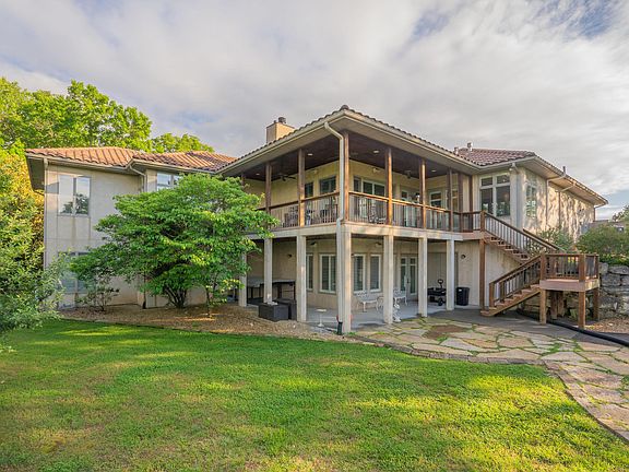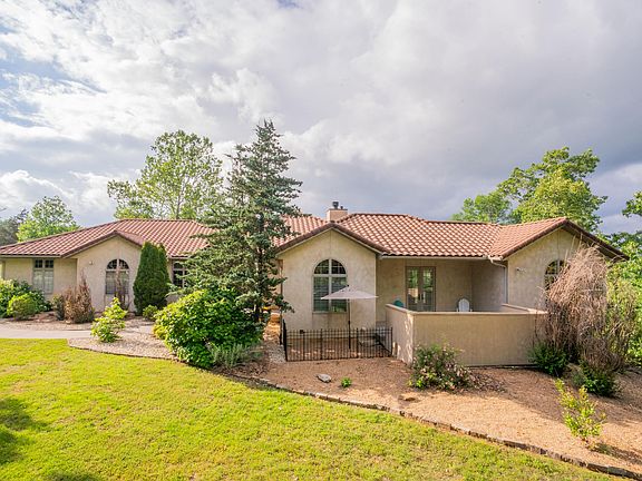 Step inside a one-of-a-kind true Spanish style home boasting beautiful landscaping, stunning views, and a spacious three-car garage. Enter through the impressive 8-foot solid wood front door into a luxurious living room with a stone gas fireplace, French doors, plantation blinds, and tile flooring.The chef's style kitchen features a built-in Viking refrigerator, Viking 6-burner gas cooktop paired with warming Viking hood, Wolf double convection ovens, dishwasher, custom cherry cabinets, a large island with a built-in microwave, granite countertops, and a walk-in pantry!The master bedroom offers French door access to the deck. The master bath includes a soaking tub, tiled walk-in shower, separate commode room, and a spacious walk-in closet. Enjoy the covered patio with panoramic Ozark views and enjoy the occasional roar from the nearby tiger sanctuary. As you walk into the spacious walk-out basement you will be greeted with 10-foot ceilings, custom cherry bookshelves, a pellet stove, wet bar, flagstone patio, vaulted safe room, extra storage, a concrete tornado shelter, a John Deere room, zoned HVAC, water softener, and so much more. Don't miss this opportunity to own an amazing, private, custom home on 3.68 m/l acres!
