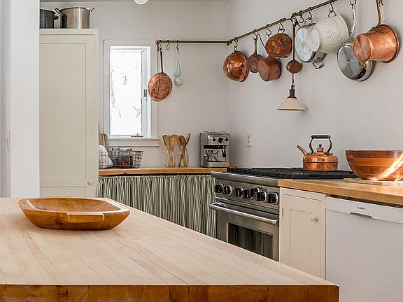 The 2,500+ square foot residence unfolds with warmth and intention. On the first floor, a cozy living room with a wood-burning fireplace invites quiet mornings and intimate evenings, while a separate dining area provides a gracious setting for gatherings. The custom DeVol kitchen, imported from England, is anchored by a farmhouse sink, brass fixtures, a sleek Smeg Italian refrigerator, and a professional Viking range. A full bathroom, dedicated laundry room, and beautiful pine floors run throughout, tying the spaces together with timeless warmth and character.