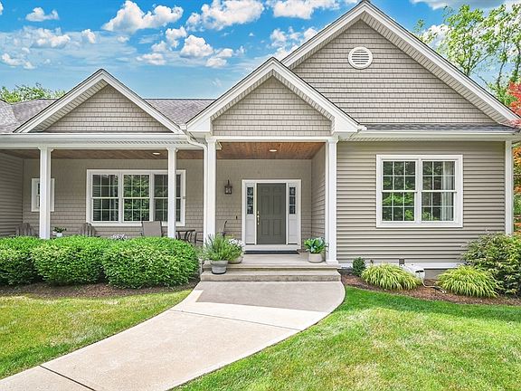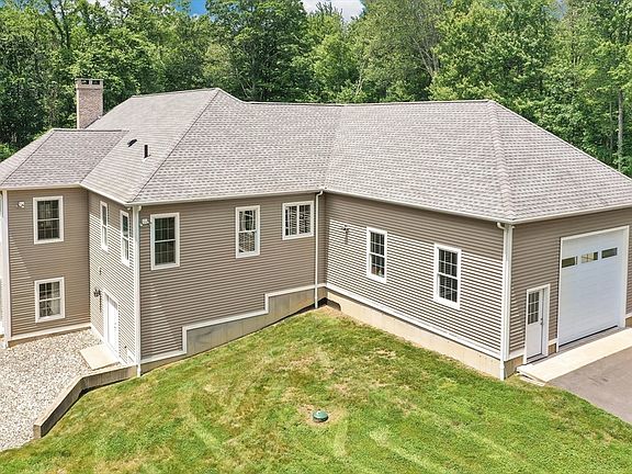 This custom-built ranch is a rare gem on over 54 acres in Granville, MA, just beyond the Granby, CT border. Enjoy spacious one-level living with 3 large bedrooms and 3 full baths. The stunning kitchen with a central island opens to a family room with a native stone fireplace. A cozy den with its own fireplace adds charm, and the third bedroom offers a home office option. The main level features 9-ft ceilings and custom millwork. The lower level includes an oak staircase, 9-ft ceilings, full bath, walkout, hobby room, wine cellar, and a full bay garage door to the utility room. The home is heated by a hybrid geothermal and propane system with owned tanks. Car enthusiasts will love the oversized heated 4-car garage (28x24 is 1 bay) one with a lift, 60-amp subpanel, and compressed air. The garage connects to both levels. A finished oak staircase and subflooring in the attic offer expansion. Surrounded by nature, this home is private, peaceful, and full of thoughtful features
