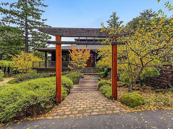 This exquisite single-level, 3-bedroom, 2.5-bath custom home spans just over 3,000 sq. ft. on nearly five acres of landscaped gardens and orchards. Thoughtfully designed with a step-free entry, radiant-heated quarter-sawn white oak floors, and air conditioning, this home is the perfect blend of luxury and comfort. The chefs kitchen features soapstone counters, a farmhouse sink, custom mahogany cabinetry, and top-of-the-line appliances, including a Liebherr fridge and Miele multifunction oven. The dramatic living room boasts a soaring 28-foot clerestory, built-in surround sound, and a charming Rumford fireplace. The primary suite includes a spa-like bath with a Bain Ultra air jet tub. A walkout basement offers over 1,200 sq. ft. of versatile space, including a wine cellar and roughed-in bathroom. Outdoors, enjoy stunning rock formations, lush landscaping, and a variety of fruit trees, from apples and persimmons to citrus and berries. Equipped with solar panels, a backup generator for energy reliability, and fire sprinklers for added safety, the property also includes a workshop, a garage with potential studio above & mission-style lighting. Located minutes from Bonny Doon Elementary, local wineries, beaches, & Hwy 1, this property offers tranquility, sustainability, & convenience.