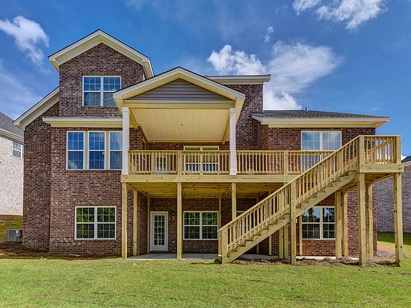 This fully bricked Bridges II plan features five bedrooms and three and one-half bathrooms with the primary suite on the main floor and an unfinished basement. There is a formal dining room with judges panels and a coffered ceiling and spacious family room with a gas fireplace. French doors lead to a formal living room. Hardwood flooring is throughout the main living area. The gourmet open concept kitchen features a large island with pendant lighting over top, a gas stove, and built in microwave and oven. The beautiful breakfast area has easy access to a covered porch with additional decking for relaxed outdoor living. The primary suite features a boxed ceiling, spacious walk-in-closet, and luxurious bath with soaking tub and separate tile shower. Upstairs you'll find remaining four bedrooms, two shared bathrooms and a huge bonus room!