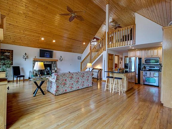 Mountain top living at its best! PERFECT Chalet with DOUBLE GARAGE in gated Crisp Mountain community on almost 1 acre of pristine grounds. GORGEOUS MOUNTAIN VIEWS, mature trees, shrubs & a rock waterfall spilling into the pond for waterfront sounds. Open floor plan hosts a separate dining room & Great Room with hardwood floors, wood ceiling, a stone fireplace and double door access to your deck to enjoy the views. Your kitchen has stainless appliances, granite & island/breakfast bar. Down the hall is the laundry and guest bath/bed with porch access. Upstairs is the SPACIOUS Master Ensuite! Downstairs to your Rec Room with fireplace, bath, bonus room & custom office. Come see your home today!