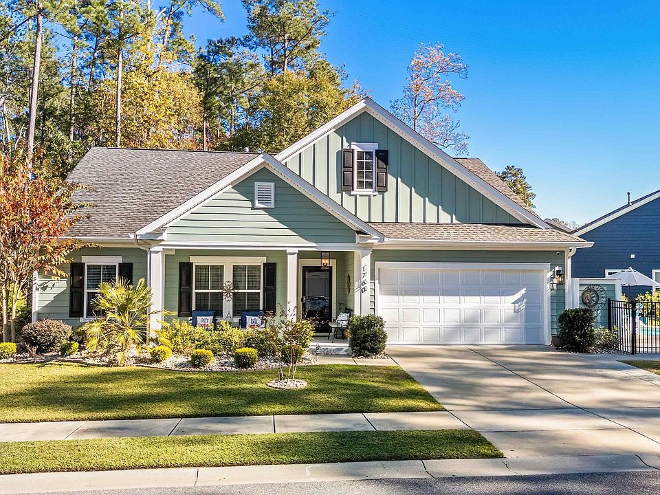 Welcome to 1760 Barrister Lane, a stunning 4Br/2Ba residence situated on a quiet cul-de-sac in the exclusive Estates at Withers Preserve.  This highly sought-after natural gas community boasts only 42 select larger homesites located in The Market Common.  This incredible home embodies modern coastal elegance both inside and out.  A true highlight of this home is the Outdoor Oasis showcasing a Private Heated In-Ground Saltwater Pool with a fountain, multiple sitting/lounging areas, a lighted Pergola with a grilling station, all surrounded with stunning landscaping for privacy and complete with enchanting nighttime lighting. Enjoy a dip or swim year-round! Step inside from the covered front porch and admire this beautiful freshly painted Barrett II floorplan presenting spacious rooms, soaring ceilings and a large Foyer with extended Sitting Area.  Enjoy an elegant gourmet Kitchen offering a Grand Island for seating and prep area, complemented by a large stainless steal undermount sink, with all new pendant & undermount lighting, backsplash, Gas Stove and Refrigerator.  Entertain many with a roomy Breakfast Nook or the Formal Dining Room that is tastefully connected to the Kitchen by an arched entryway. Storage is effortless with abundant cabinetry and a pantry featuring wood shelving making any cook feel organized. The Great Room measuring 20x16 offers endless possibilities for furniture placement and features a Gas Fireplace creating a warm inviting space for gatherings and relaxation. This floorplan strikes a perfect balance- exceptionally open and grand for entertaining, but designed with multiple designated spaces like a second Living Area or Office, a cozy Carolina Room with mini split and Gas Fireplace and a Formal Dining Room offering French Doors that lead to the outdoor pool retreat. The Primary Suite is spacious with a spa-like bath presenting a Soaking Tub, tiled glass Shower enclosure with Seat, Double Sink Vanity, Linen Closet and a deep walk-in Wardrobe Closet. A dreamy Laundry Room boasts extra soft-close cabinetry, a convenient sink, and charming penny tile backsplash that adds a touch of elegance. Two generously sized Guest Rooms are tucked away along a spacious hallway, providing privacy and convenient access to a full bath.  Upstairs, you will find the 4th Bedroom, featuring a sleek modern sliding door with two generous closets. Another door leads to a spacious walk-in attic thoughtfully designed with shelving for ample storage and a temperature-activated attic fan. The freshly painted 2 car garage comes equipped with cabinetry. Additional custom upgrades include a 10x18 rear patio, 2 storage sheds, and a fenced gardening area, all overlooking serene wooded wetlands.  The lush landscaping offers brick curbing, white stones, irrigation and nighttime lighting.  Some furnishings may be purchased separately.  Just minutes away are multiple grocery stores, restaurants, entertainment and beautiful sandy beaches ( just take your golf cart )  Schedule your tour today to experience this exceptional beach retreat !