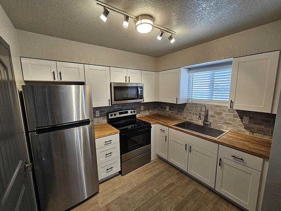 Typhoon ice counter topsDoggy doorKraus deep kitchen sinkWood imprint ceramic tileStainless steel appliancesAll-white shaker style cabinetsFaux wood blinds