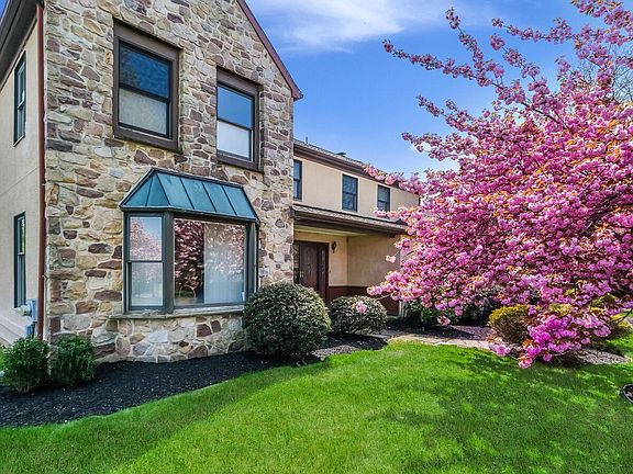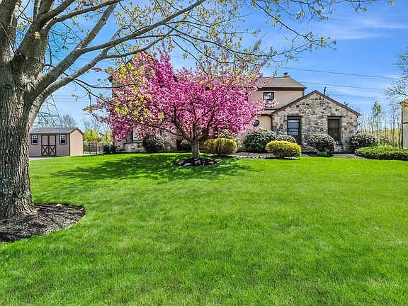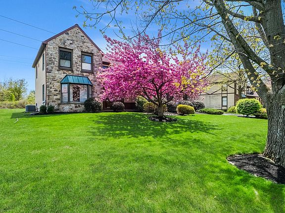 Partial stone front & stucco 4 BR, 2.5 BA Colonial in Sovereign Estates. Double front doors open to 2 story Foyer with oak parquet floors. Formal Living room & Dining rooms offer wall-to-wall carpet, crown molding, chair rail & large bay windows welcoming in the sunshine. Large Eat-in Kitchen with ceramic tile floor, oak cabinetry, ceramic tile backsplash, stainless steel appliances including dishwasher & electric cerran top range with overhead microwave. Breakfast room with ceiling fan, deep bay window & half wall overlooking Family room featuring brick fireplace with raised hearth & sliding glass door opening to large partially covered wrap around 2 tier deck with hot tub & yard. The first floor also offers a Powder room with chair rail & tile floor & Laundry room. The second level features Master Bedroom with vaulted ceiling with skylight, walk-in closet, french doors leading to balcony & full bath with ceramic tile floor & partially tiled walls, large vanity & tiled walk-in shower with built-in seat & glass door. Three additional nice sized bedrooms & full hall bath with double vanity & tiled tub/shower combo. Full, unfinished Basement with plenty of storage. Large yard with area for fire pit & storage shed. 2 car side entry Garage. Great location, neighborhood borders Bucks County Country Club.