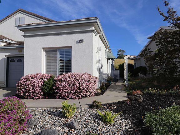 Open House Saturday 1-4 pm. Summerset 2 Duet model. A 55 & over gated senior community with 2 bedrooms, 2 baths, 994 sq. ft., lot 2,630 sq ft & a 1 car garage. Large guest room & closet w/mirrored closet doors, and plantation shutters. The hall bathroom with shower/tub combo with new tile floors. Hardwood floors in hallways, living room and the kitchen. Tastefully decorated living room with ceiling fan & plantation shutters. The kitchen has Quartz counters & backsplash, stainless steel sink w/custom faucet, stainless-steel appliances with gas stove/oven, microwave, dishwasher & refrigerator, with white cabinets & plantation shutter. The Master/primary bedroom with carpet, ceiling fan and sliding door with custom window covers. The master/primary bathroom has shower stall, new tile floors and a walk-in closet. Custom chandelier in entry and the laundry is a stackable washer & dryer in a closet perfectly tucked away. The back yard is an excellent location backs to open space hill side with patio, landscaping, and patio furniture to stay. The HOA $115 monthly includes, Pool, Spa, Gym, Club House, Library, ball room, tennis, bocce & more. Close to Shopping (Safeway & CVS), Restaurants, Golf & Recreational Parks.