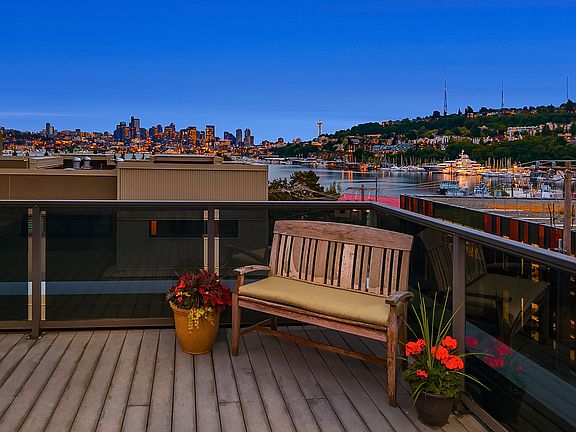 Luxury awaits at the highly sought after Regata Condominiums. This top floor, penthouse unit offers a generous, open floor plan including 2 bedrooms + den, 1.75 baths, Chef's kitchen & uncompromising finishes throughout. Expansive private patio extends off living room with nearly 1,000 sq. ft. of outdoor living space. Enjoy exceptional views of DT, Lake Union & Gas Works while lounging around the gas fire pit or relaxing in the jacuzzi. This rare opportunity will not last long! 2 pkg & storage
