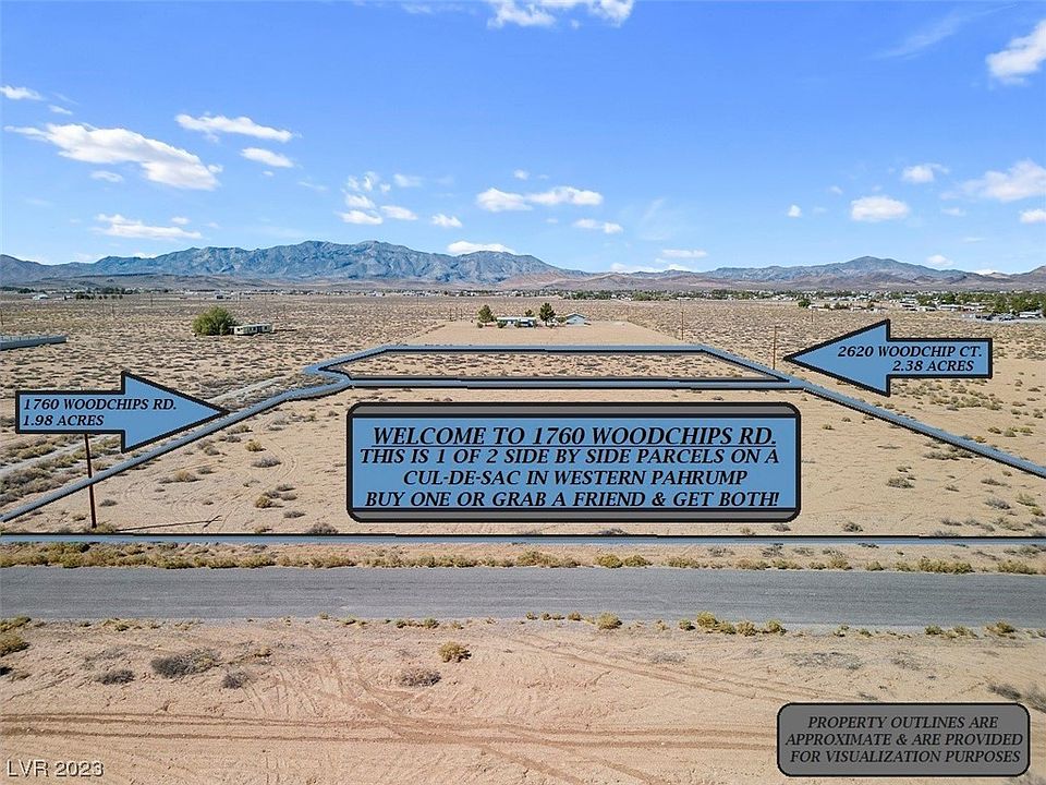 Welcome to 1760 Woodchips Rd.~This 1.98 Acre Lot is One of Two Parcels for Sale Located on 4 Parcel Cul-De-Sac & Already Has Power To The Property Line~Located Less Than 10 Minutes From The Center Of Town With Amazing Mountain Views & Wide Open Spaces~This is a Wonderful Opportunity for Friends or Family Members To Live Side By Side~The Other Parcels Is: 2620 Woodchip Ct. & Is Listed Separately~Water Rights Will Be Required To Drill Your Private Well, But Don't Let That Deter Your Acre Dreams As It Is Priced Accordingly & Lower Than Those That Already Have Water Rights Dedicated~Whether You Buy One Or Both, Ask Questions and Get Your Piece of Pahrump At These Prices Today!