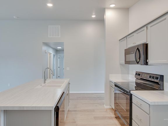 The Chandler 1447 | Kitchen opens to large living room with great sized island, ton of cabinet storage, full tile backsplash and flows into the formal dining room. Formal dining room in front makes a great dining space, home office or sitting room! Master bedroom with attached bathroom features walk-in shower, dual vanities and walk-in closet. Engineered vinyl plank throughout the great room including living room! Photos are similar. All selections are subject to change without notice, please call to verify.