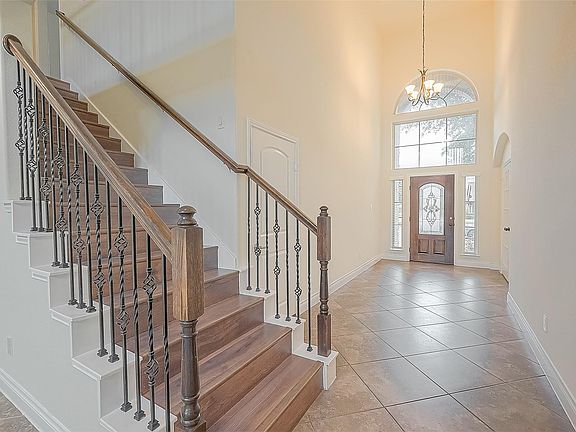 This lovely Perry home is situated on a quiet cul-de-sac street offering great curb appeal in the desirable Aliana master planned community. Walk in to the grand foyer with high ceilings, chandelier, and diagonal tiles from front to back door and NO CARPET IN ENTIRE HOUSE. Immediately to the left is a formal dining with French doors. Continue your journey in the home to discover the large family room with high ceilings. The kitchen comes complete with plenty of granite countertop space, stainless steel appliances, plethora of 42" inch cabinets for storage. Enter the light and bright primary bedroom. Relax in the primary bath that comes with garden tub, shower, double sinks, vanity and a spacious walk-in closet. Upstairs is equally impressive with three large bedrooms, two full baths, and a generous size gameroom. The sunroom is the ideal escape from the rest of the home and relax in. Enjoy weekend BBQs or shoot home hoops on the basketball goal in the backyard.