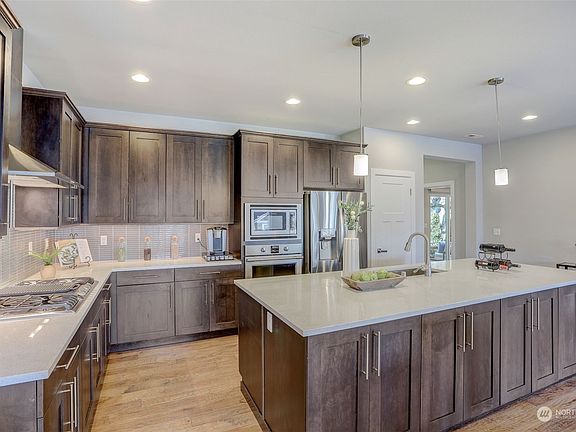 Experience luxury living with this east-facing marvel. High ceilings and hardwoods set the stage throughout the great room, designed for entertaining. Gather around the striking floor-to-ceiling tile fireplace with access to the deck and expansive windows bathing the room in natural light. The open kitchen is adorned with a grand quartz island, designer backsplash, and stainless-steel appliances. The home boasts 2 primary suites with 5-piece baths, one on main, other on upper. The floorplan offers flexibility with a lower floor office/bedroom, an upper-level bonus loft, and 2 additional bedrooms up. Positioned close to Mill Creek Town Center and parks, with easy access to highways, this home seamlessly merges opulence with convenience.