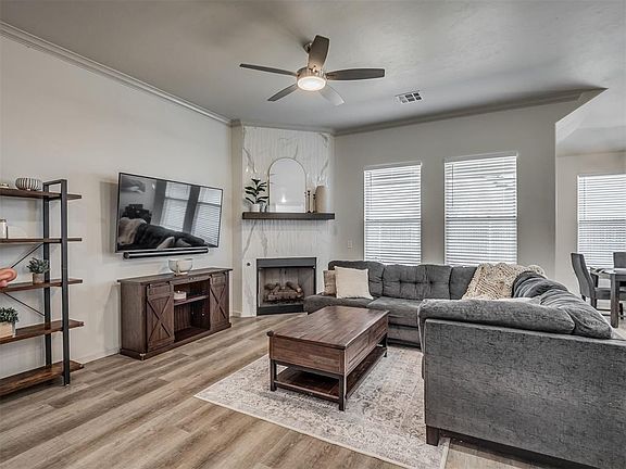 Welcome to this immaculate one-owner home in The Meadows at MacArthur Park, located in the highly sought after Deer Creek School District! This beautifully maintained 3 bedroom, 2 bath home with a dedicated study offers a warm and inviting layout designed for both comfort and functionality. The living area with lots of windows and a stunning marble-look fireplace with gas logs, dining space with great views of the backyard, and kitchen with large center island, quartz countertops, gas range, and oversized walk-in pantry all create a light and bright open concept area just perfect for entertaining. The wonderful split floor plan provides privacy with the tucked away primary suite, complete with a spa-like ensuite bath featuring a large tiled shower, separate soaking tub, and generous walk-in closet that connects directly to the spacious laundry room/drop zone with built-in mud bench and storage. Located off the front entry are two nice sized guest bedrooms and a full hall bath completing the split plan. The separate study with barn door is conveniently located off the the living area and could also serve as a play-room or flex-space. Enjoy outdoor living in the east facing backyard with covered patio, ideal for entertaining or relaxing. Additional features include a fully fenced yard with automatic sprinkler system and full house gutters. With easy access to Portland Avenue (74) and I-344 (turnpike), you're just minutes away from Mercy Hospital, and many shopping, dining, and entertainment options. This home is move-in ready and a MUST SEE!!