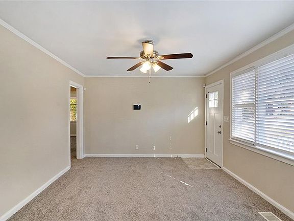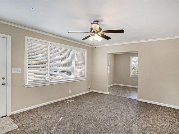 Charming 3-bed, 1-bath ranch-style home featuring a fenced yard and a pull-around driveway with a detached 1-car carport. The living room and bedrooms are carpeted, while the dining area and kitchen have laminate flooring. The kitchen boasts white cabinets, granite counters, and stainless steel appliances. The bathroom includes a shower/tub combo, offering both convenience and comfort.