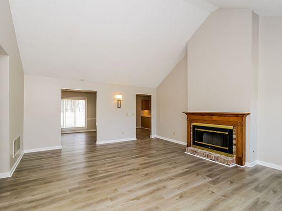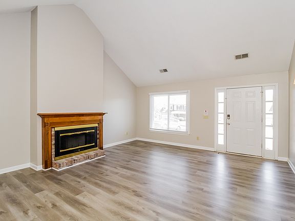 Step into the open and airy main living area, where vaulted ceilings and luxury vinyl plank flooring create a spacious and inviting atmosphere. The room is filled with natural light and features a wood mantel, offering a warm and comfortable focal point for everyday living.