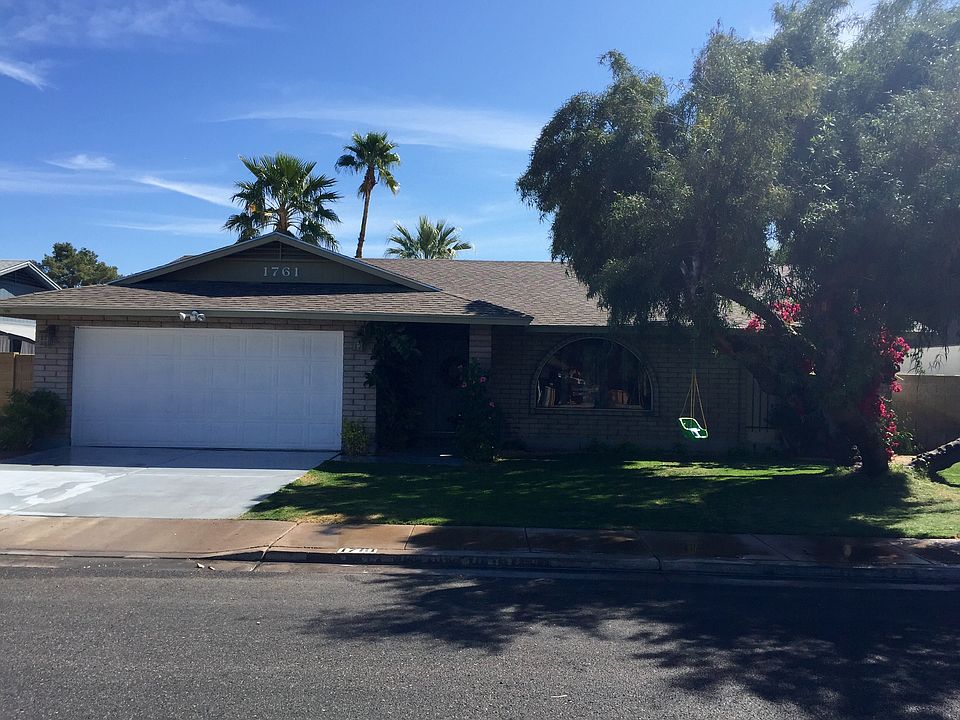 Tropical Paradise in your own backyard awaits in Dobson Ranch!! You will appreciate the Ideal Location with Large Lot knowing your daily vacation destination beckons you into your private Oasis!! Your new block home with great curb appeal greets you with lush mature landscaping, large character tree including ''swing'' perfect for creating memories! Intimate front patio with double door entry open to where you and your family will enjoy the large sunken living room, separate large dining for the holiday gatherings & second family space for reading, reflecting or visiting with the ''cook''. Kitchen with new facelift cabinets and emerald silestone counters with Stainless Steel Refrigerator, open with breakfast bar counter continue the vacation vibe! Large Split Master with double door entry