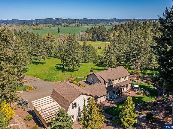 Oregon at its best on this gorgeous 5.41 treed acreage w/long private drive. Charming custom one owner home sits on beautiful terraced hillside. Lots of upgrades, amazing built ins, rich oak flooring & beamed ceilings. Enjoy amazing views from wraparound covered deck. Above Garage is a 755 SF heated bonus rm w/half bath & 4 large closets. Covered RV Pad. 2 Story shop/Barn with Racquetball Court & walking track on 2nd floor. Heated pump house w/2500 gal storage tank & water filter; generator; sprinklers.