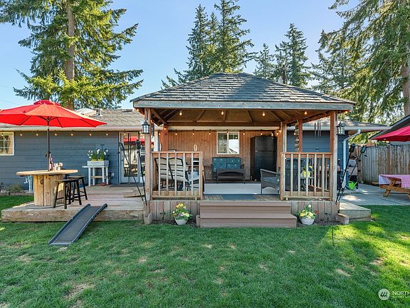 Stylishly updated, superbly maintained, "Mid-Century" one-level/rambler home on a larger corner lot in Arlington. Less than 5 minutes to shopping, I-5 and trails! Many updates the past few years: new roof and windows 2019, countertops 2021, LVP (luxury vinyl plank) flooring and new carpeting 2022 (over existing original hardwood floors), interior paint 2022, natural gas line installed with new gas fireplace and much more. Built 1969 with 3 bedrooms, 1 full bathroom and 960 SF. Fully fenced spacious backyard is level, new fire pit with metal ring. Also two outbuildings (one with power), a wonderful gazebo and patio for entertaining. Covered RV parking/carport in backyard. You're going to love this home!