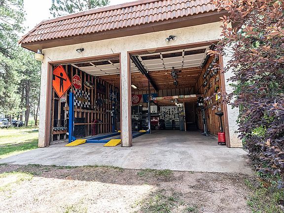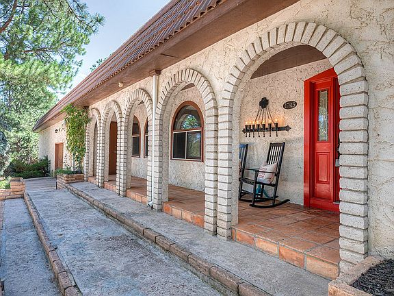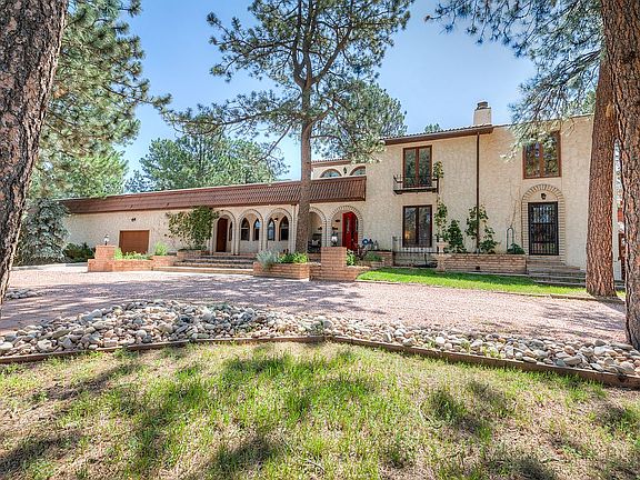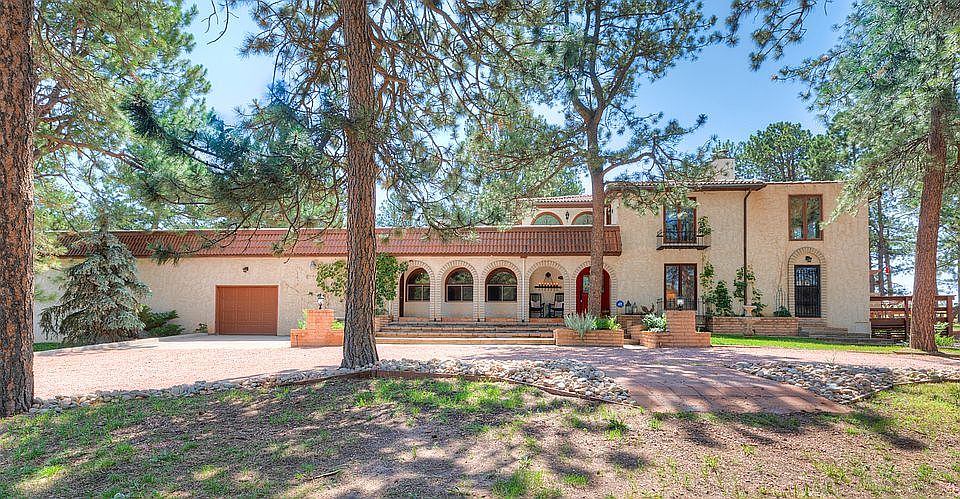 BEAUTIFUL HORSE PROPERTY WITH EUROPEAN CHARM! This one of a kind Spanish estate sits on over 8 acres in northern Black Forest within the popular Canterbury Estates. There is an ideal mixture of trees & meadow with unobstructed views of Pikes Peak & 3 fenced pastures. Step inside to find a unique layout that provides an opportunity to customize the use of space to meet your needs. The entry greets you with an optional guest suite boasting an expansive attached bath, custom built-ins, walk-in closet, & available wood burning fireplace. The living room offers a cozy space for hanging out next to the fireplace. The formal dining room offers 16 ft ceilings & a one of a kind wood burning stove that was reclaimed from a museum. The chef’s kitchen offers plenty of space, unique soapstone countertops, double ovens, range top, island for serving & lots of cabinets. Walk out from the kitchen offers a special room that can be designed to your heart’s desire. This massive 3 seasons sunroom runs the length of the home, has another connection for a wood burning stove or can support a hot tub. Enjoy your views & privacy with warmth year round! Upstairs you'll find your primary suite, 3 guest beds, a full bath. There is also access to your rooftop for a massive outdoor space! The 6th bedroom is also on the main level & would make a great private office space w/ attached full bath. The fully finished basement offers a family room, dry bar, ¾ bath, hobby/craft room, laundry space, & storage areas. An attached 3 car garage & workshop space w/ car lift finish out the main home. Outbuildings for the property include a 3 stall barn w/ loft, 4th car garage for toys, & a greenhouse. Other extras include a wrap around deck w/ views of Pikes Peak; whole home generator; multiple furnaces & thermostats; car lift in workshop; pool table; cross fenced for livestock; 2 wells. Come make this special home your own with unique architectural & design features that you cannot find anywhere else.