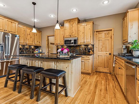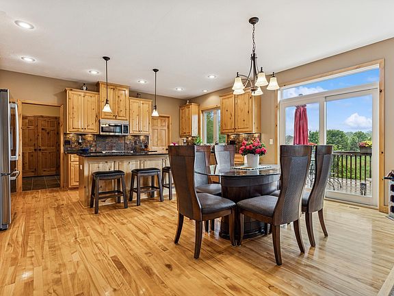 Welcome to this stunning custom-built K.A. Witt Construction high-end home that combines timeless natural materials with luxurious modern conveniences.Warmth and character of rustic Alder woodwork, sourced from Washington State & Vancouver BC, and rich red Birch hardwood floors throughout. The spacious, open-concept layout offers elegant flow and thoughtful design. The gourmet kitchen is a chef's dream-equipped with premium Bosch appliances, granite countertops, and an enormous walk-in pantry. Custom cabinetry provides tons of storage, making organization effortless. Just off the dining area, step out onto the expansive deck, ideal for entertaining or relaxing with peaceful views overlooking the pond and frequent visits from wildlife. The main level offers all living facilities, including a luxurious primary suite with a large walk in closet. The lower level walk out features two bedrooms, a large family room, wet bar, cozy wood-burning fireplace and patio access. Oversized 3 car garage!