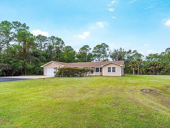 Jupiter Farms home with 1.40 Acres with spacious 4 Bedrooms, 2.1 Bathrooms, 2 Car Garage, Screened Covered Pato, Fireplace, Extended Driveway. The living room & dining room each features a Bay window. Custom built kitchen cabinets include granite countertop and large pantry. The water softener includes reverse osmosis treatment. Generac generator with 2 tanks, solar panels & hurricane shutters included. New 2023 air conditioner & water heater 3 years. Shed 14 X 40 included. This split floor plan has 2 bedrooms on each side, tile & carpet flooring.