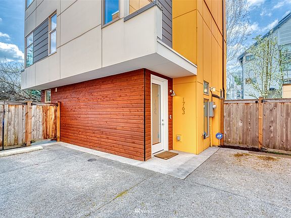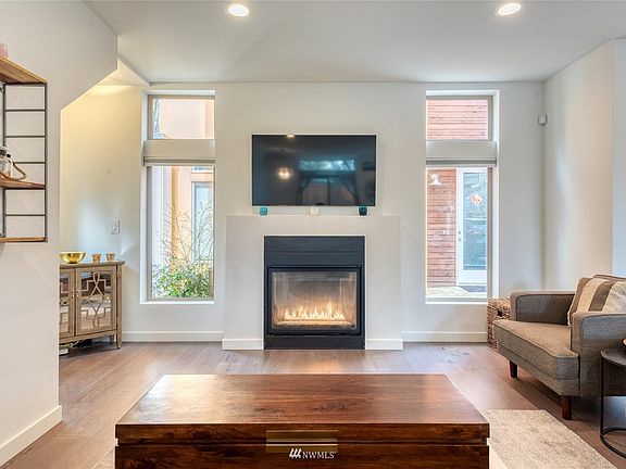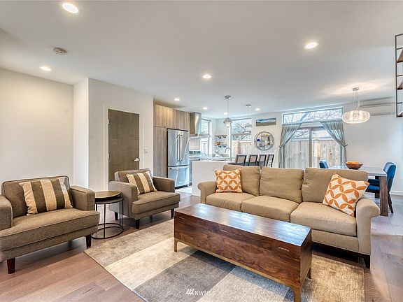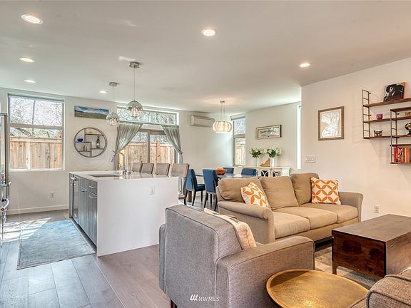 Rare find of this detached, spacious, and modern home with 9ft ceilings throughout. Be welcomed to your home with off street parking, and a living area on the entry level. Great room offers a spacious eat-in kitchen w/ large kitchen island, dining room w/ fenced patio access, and a fireplace in the living area to cozy up to. Main floor also has ample storage with multiple closets. Up the stairs, find 2 large bedrooms and a full bath with extra space for an office or play area. Enjoy the top floor primary bedroom with expansive 5 piece bath, walk-in shower, and a closet to swoon over. The top floor laundry is a full room with extra space. Follow up to take in sun and the Mt. Rainier views from the expansive roof deck built for entertaining.
