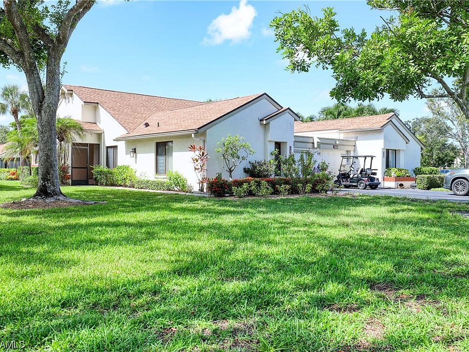 Opportunity knocks to bring in all your remodeling ideas to make it your own with this 2 bedroom 2 bath garden villa on parklike setting with golf course and lake views. Sliders from kitchen and living room lead to oversized patio. (Lanai was damaged from hurricane and removed and will not be replaced). Large living room, formal dining room. Both bathrooms offer walk in showers. Master bedroom has large walk in closet with access to attic storage. 1 car garage with electric screen, Roof replaced last year. Seven Lakes a 55+ active golf and tennis community with an 18 hole executive golf course- no transfer, green or trail fees, 6 heated pools, har tru tennis pavilion, on site restaurant, fitness center, billiards, wood shop, bocce, pickle ball, socials, dances, card rooms and so much more. A true bundled community where all fees are included in monthly fee excluding electric. Centrally located across from Bell Tower in the heart of Ft Myers close to shopping, dining, RSW airport, Barbara B Mann Theater. Lanai will be being replaced !!!!! AGENTS PLEASE SEE CONFIDENTIAL COMMENTS !!!!