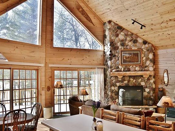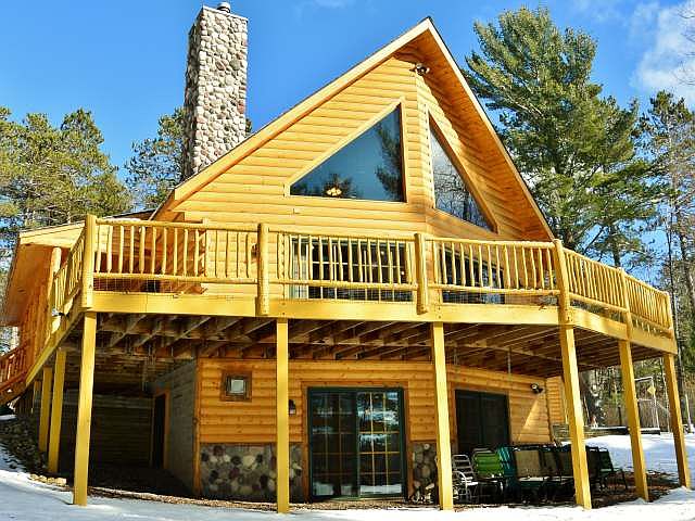 Northwoods chalet style home only 5 miles North of Minocqua. Park-like setting, landscaped grounds, lakeside wrap-around deck and a very gentle slope to the 200' of frontage of sandy swimming frontage on pristine Bayer Lake. No to-do list, enjoy this immaculate, move-in condition home immediately! Custom built in 2003, featuring three levels of living space. Main floor features a soaring ceiling with open concept floor plan, gas fireplace & lakeside wall of windows. Open concept kitchen offers large island, plenty of cabinet space and brand new slate appliances. First floor laundry, large bath and two bedrooms complete the first floor. Spacious loft has private master bedroom and den area. Full walkout basement features cozy family room with gas stove, game/exercise room, bedroom and full bath. Quality construction with high efficient nat gas furnace w/ central air. Spacious detached 40'x28' 4 car garage. New aluminum roll in pier included! Lakefront retreat or year round family home.