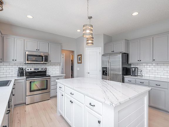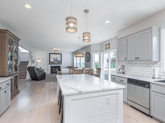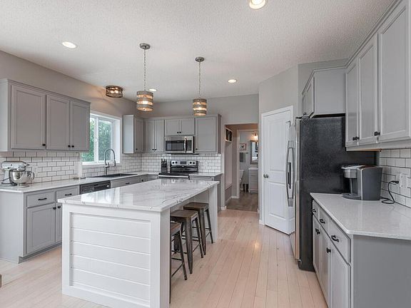 Spacious Modified 2-Story features beautifully updated Kitchen, Baths & flring thru-out, refinished hwd flrs, Great Rm w/gas FP, 4 Bdrm on one level & finished walkout LL w/5th Bdrm. Located on cul-de-sac street, Home has new Roof & freshly stained Deck ‘22. Kitchen has Lg ctr island w/striking c-top & lights, breakfast seating, ss appls & walk-in Pantry. Adj Dining has patio dr to Deck. Great Rm has Lg windows o’rlooking Bkyd. Living Rm is currently home office. Mud Rm has built-in locker/cubbies. Inviting Loft is landing to 4 generous Bdrms, incl Owners Suite w/walk-in closet & private Full Bath, complete w/corner soaking tub & tiled step-in shower w/glass drs. UL incl Full Bath & Laundry Rm. Walk-out LL has Lg Family Rm w/recessed lighting. Dbl barn drs lead into Lg 5th Bdrm w/walk-in closet. Beautifully updated ¾ Bath complete LL. Garage is insul & Front Porch provides inviting space to relax. Walking distance to park w/plygrnd. Near shops/restaurants. Easy access to Hwys 169 & 35W