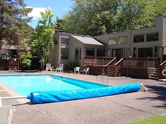 Spacious 1-level, end-unit. Vaulted ceilings, private, light and bright, lives big! New SS appliances, flooring and paint! Move-in ready! Open floor plan, ideal for entertaining. Big FR with fireplace and access to private balcony. Efficient kitchen with eating bar. Large master bedroom with walk-in closet. Pool, sauna, clubhouse and park-like setting. Close to shopping, Nike, Intel, transit, Sunset HS, downtown Portland and hwy 26.
