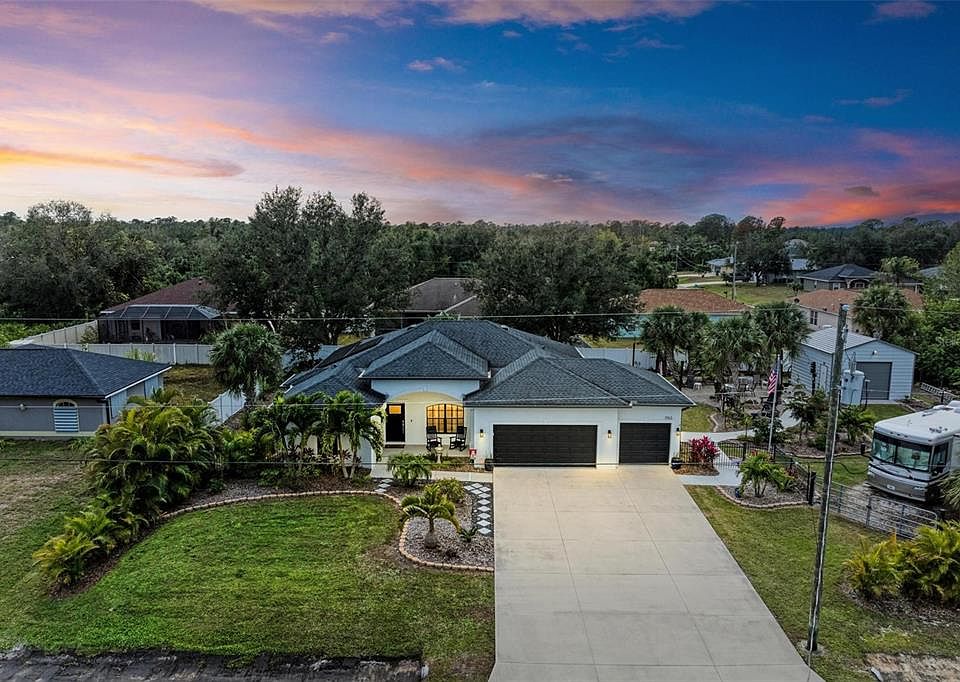INCREDIBLE SOUTHWEST FLORIDA RETREAT AWAITS NEW OWNERS ON THIS DOUBLE LOT HOMESITE WITH A SINGLE OWNER WINDEMERE BUILT CUSTOM HOME with 3 BEDROOMS, 2 BATHROOMS, A DEN, A 3 CAR GARAGE, SOLAR PANELS, A SEPARATE GARAGE/WORKSHOP, 50 AMP RV SERVICE, A SEPARATE DRIVEWAY FOR BOAT/TRAILER/RV STORAGE, A FULLY FENCED BACKYARD, & INCREDIBLE LANDSCAPING AND CURB APPEAL. Inside enjoy a great layout with the front porch beckoning you inside to the foyer with the office to the right and two great guest bedrooms with fantastic light and closet space and a shared bathroom with upgraded vanity and tub/shower combo. Farther in, the great room opens up to the kitchen with granite counters, a large breakfast bar, upgraded appliances, and the dining room, all overlooking the beautiful private backyard with covered and screened lanai. Off the kitchen, the primary suite has sliding door access to the lanai a large walk-in closet with extra shelving, and an en suite bathroom with separate Roman shower and soaking tub, dual vanities, and a private toilet room. Also off the kitchen, a wonderful laundry room with extra storage connects to the 3-car garage with extra storage. The home has plank tile flooring throughout and custom cabinetry, as well as great architectural additions and niches. Outside on the lanai notice there is room for a pool, a connection for a TV, and just outside in the yard, the thoughtful addition of a shower to rinse off after working in the yard. In the side yard, the huge metal workshop with garage door/power and a great patio area are great additions to the site. With irrigation throughout and beautiful gardens and fruit trees, as well as multiple added hose spigots for convenience, relax and enjoy the lovely oasis. Park your boat, RV, and all of your toys on the extra lot with great security and convenience behind the fencing. The security cameras on the outside allow for peace of mind while away, and the solar panels are another added touch for convenience in reducing your power bill! This home has been meticulously maintained, is IN FLOOD ZONE X (no flood insurance required), and is convenient to all things North Port and I-75! BE SURE TO CLICK THE FULL VIRTUAL TOUR LINKS FOR DETAILS and schedule your showing today!!