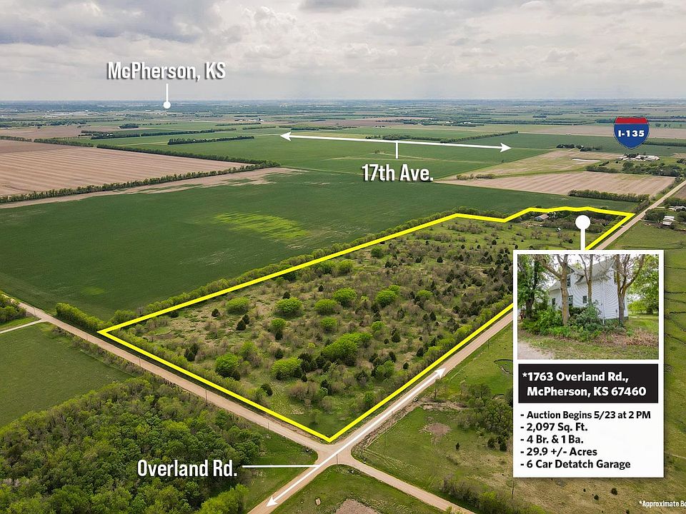 Property offered at ONLINE ONLY auction. BIDDING OPENS: Tuesday, May 23rd, 2023 at 2 PM (cst) | BIDDING CLOSING: Thursday, June 1st, 2023 at 2 PM (cst). Bidding will remain open on this property until 1 minute has passed without receiving a bid. Property available to preview by appointment. CLEAR TITLE AT CLOSING, NO BACK TAXES. ONLINE ONLY!!! 4-bedroom, 2-bathroom home on nearly 30 acres in McPherson, Kansas! This wooded lot sits at the Southwest corner of Overland Rd and 18th Ave, the perfect place for country living. Two-story home Features: Attached two-car garage Deck Living room with a brick gas fireplace Formal dining room Kitchen with a refrigerator, oven, dishwasher, and microwave 4 Bedrooms 2 Bathroom Laundry room Unfinished partial basement Exterior Features: Impressive 1,675 +/- square foot detached six-car garage with RV parking available! 40 X 80 farm utility building 30 x30 farm utility storage shed 12 x 24 storage shed 12 x 18 tool sheds 24 x 24-grain silo This property has so much to offer whether you are an equestrian, farmer, outdoorsman, or just looking for that peaceful country living! *Buyer should verify school assignments as they are subject to change. The real estate is offered at public auction in its present, “as is where is” condition and is accepted by the buyer without any expressed or implied warranties or representations from the seller or seller’s agents. Full auction terms and conditions provided in the Property Information Packet. Total purchase price will include a 10% buyer’s premium ($1,500.00 minimum) added to the final bid. Property available to preview by appointment. Earnest money is due from the high bidder at the auction in the form of cash, check, or immediately available, certified funds in the amount of $25,000.