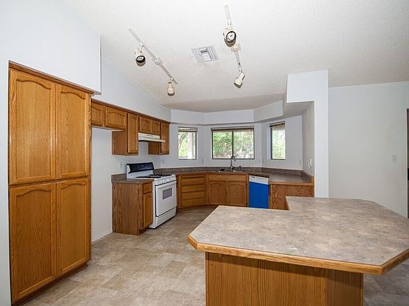 Vaulted portico entry to double front doors and formal living room with columns at entry. Additional family room to dining area and kitchen with breakfast bar and island. Bay window at kitchen. 3 bedrooms, 2 bathrooms. Covered back patio to large backyard. Elevated ceilings throughout. Master bedroom has bay window and walk-in closet. Double vanity with soaking garden tub, separate shower and water closet. Indoor utility room to two car attached garage. Circular driveway for an elegant feel.
