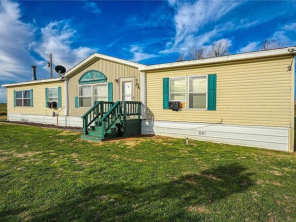 Secluded 1.5 acres with a 3 bedroom 2 bath manufactured home. Within the last 2 years new water lines, new water pump and laminate flooring throughout has been installed. This home has two living areas, built ins on both sides of the fireplace, dining room and a spacious kitchen with an island. The property is completely fenced and has a storm cellar and carport. There are two outbuildings that could be used to store lawn equipment and more or turned into a livestock or poultry barn.