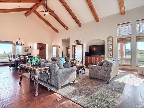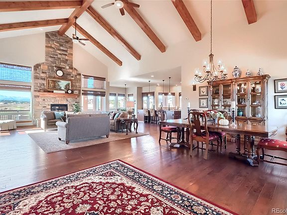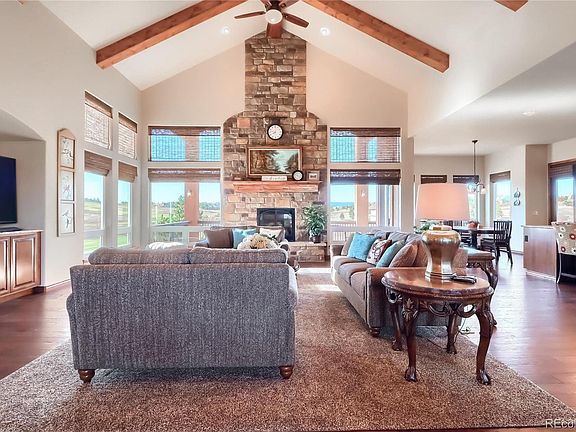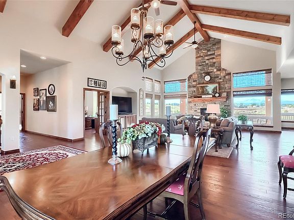 Luxury-designed estate on the Kings Deer golf course, with unobstructed Pikes Peak views throughout! This elegant home is nestled on 2.5-acres & features a blend of modern and soft rustic touches. From the moment you step inside you will feel the quality and thoughtfulness that went into its design. The spacious great room features a stone fireplace and vaulted ceilings with stained beams. The stone hearth is a perfect spot to keep warm on those chilly Colorado evenings while soaking in the picturesque mountain views. Step outside onto one of the multiple outdoor living spaces and let your eyes wander between golfers teeing off and the changing seasons atop our favorite local 14er. The chefs kitchen boasts an oversized island, granite countertops, tile backsplash, gas cooktop, pot filler, butlers pantry & large walk-in pantry. Wake up to gorgeous Pikes Peak and Fairway views from your main level master retreat. Master bath suite features double vanities, soaker tub, walk-in shower with dual heads, and separate, spacious his and hers walk-in closets. The open stairway welcomes you to the lower-level walkout family room with stone fireplace. The lower-level wet bar is perfect for entertaining, and three large bedrooms with mtn views make this area great for having overnight guests (or for kids to have their own space). Basement also features two large baths, an oversized storage room, and a secret room behind the bookcase. The oversized 4 car garage has radiant heat floor, and there is a Dog Wash room located just off garage. Only 25 minutes to the foothills for entry into Colorados breathtaking scenery, skiing and hiking. There are local trails are throughout the area and free airshows with Air Force flyovers! This home is located in the top rated D38 school district and is only 40 minutes from Denver Tech Center. This gorgeous home is sure to impress!