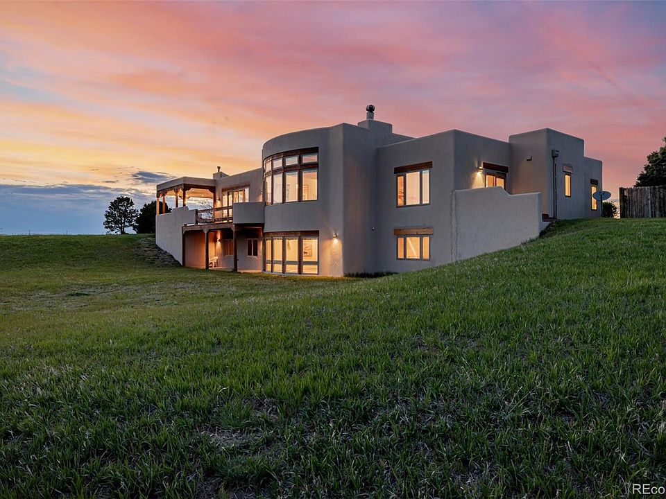 The property spans two separate 35-acre parcels being sold together, presenting unique opportunities for multigenerational living or future development. At the heart of the estate sits a custom adobe-style home with 5,293 square feet of authentic Colorado architecture. Twelve-foot ceilings with round log beams, arched doorways, and three fireplaces add warmth and character, while expansive south-facing windows capture year-round natural light and postcard-worthy mountain views.