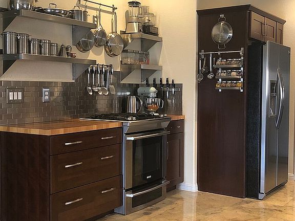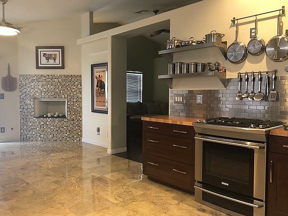 Single Story, New Pool, No neighbors in back and highly upgraded - you are home! This home has been upgraded with details such as Granite Counters, HandMade End Wood Grain Counter Tops, Wine Fridge to let the chef create their magic! Family Room and Dining is one large room with beautiful dark wood floors and vaulted ceiling. Primary features access to the pool, large custom closet and a Primary Bath with multi shower heads, farmhouse sink and so much more. All rooms flow with ease for everyone to enjoy. Step into the backyard and find an amazing covered patio, new salt water pool, pop up floor cleaners, pebble sheen interior and NO HOMES in the back - enjoy privacy as the beautiful natural hiking, biking wash sits below the home. Home has been updated with Leased Solar to allow the owners to enjoy low energy bills. This is a must see home!