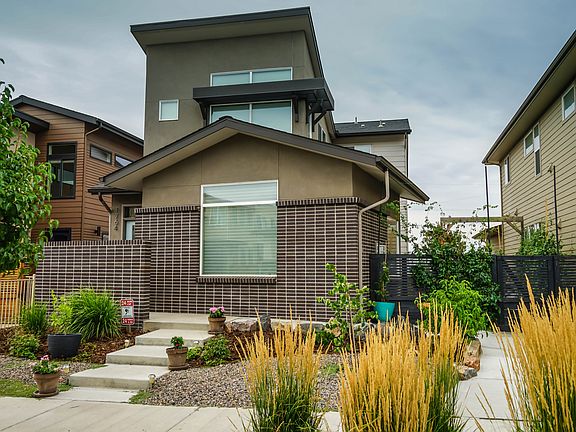 Stunning contemporary home sets the bar for luxury in Midtown! This high-end Brookfield Signature home has designer upgrades inside and out. A reclaimed wood fireplace is the focal point of the light-filled great room. A bright and modern kitchen with built-in custom granite island invites indoor/outdoor living. Sliding glass doors open to a private garden w/ an outdoor fireplace. Masterfully designed landscaping w/ honeysuckle vines, climbing roses, and built-in space for planting a garden. Fully xeriscaped yard is low-maintenance. Beautiful master suite w/ vaulted ceilings and huge walk-in closet. Decked out 5-piece master bath with oversized tub and steam shower. 3 bedrooms upstairs and two in basement. Premium whole house water filtration system delivers clean water throughout the home. Many upgrades not found in other Midtown homes! Extended cement patio, two outdoor gas lines, security system, built-in home sound system, keyless entry, whole house vacuum and a finished basement with a sommelier's wine fridge included! Energy Star certified, enjoy the benefits of a tankless water heater and solar shingles. An enviable location - just steps from community hangouts like Bruz Beers and Bonbons Cafe and Dessert Bar, and easy access to downtown Denver. Enjoy a wide variety of neighborhood amenities: dog park, clubhouse and playgrounds. Close proximity to Clear Creek bike path & RTD Light Rail! A must-see Midtown property! Don't miss the virtual tour, 3D tour and virtual open house video! Vacant, staged, and professionally cleaned & sanitized.