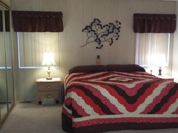 Seasonal/year around living in a gated senior park in a quiet secluded area relax and unwind in the mineral water pool and spa.Located on a corner home site. Spacious living area w/separate dining room, large kitchen eating table,pantry,2 bedroom, 2 bathrooms. Windows are over sized custom with dark shades you can see out but not in. Security screens doors. Carport has been extended on the side. Has privacy wall, The home shows with pride of ownership clean move in condition. No smoking or pets have been in home. Outside has a large covered porch facing East and an extra tall carport on the West side. Separate laundry room inside, ample storage and closets, a large storage shed 9X12 (holds golf cart). Sold TURNKEY ALL appliances are included and furnished. Space rent is $335 per month, long term leases are available 5-20 yrs. Only 81 spaces in the community. Amenities include, pool table, laundry facility, large clubhouse,natural hot mineral pool and spa. Gold cart sold separately.
