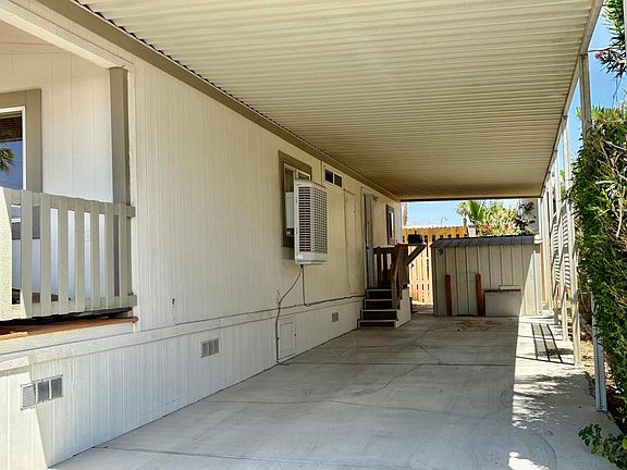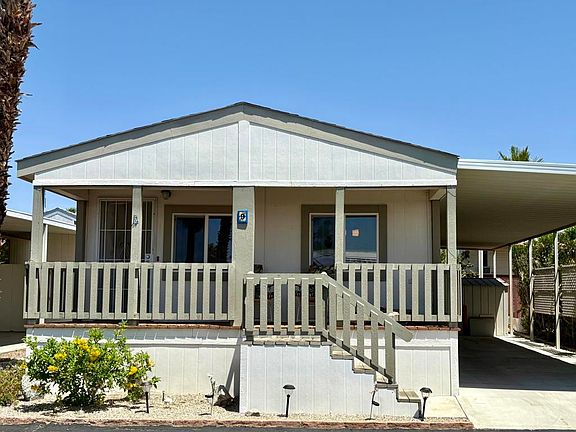 Welcome to Corkill Palms Mobile Home Park! This Beautiful, well maintained, 2 Bedroom , 2 Bathroom home is being offered Turnkey Furnished! As you walk through the front door you will see that this home is very spacious and has an open floor plan with vaulted ceilings. The bright & cheery Kitchen has a gas range, refrigerator, dishwasher, & microwave with lots of cabinets & counter space. The Primary Bedroom has an en suite with a large walk in shower. There is also a guest bedroom & bathroom. Separate laundry room with washer & dryer. Easy access through the laundry room to the covered carport & shed. You can sit out on your lovely covered porch and take in the breathtaking desert & mountain views. Corkill Palms offers the HOT mineral water in the pool & spa, putting green, BBQ, billiard & card room, and many social activities. The space rent is one of the LOWEST in the desert! The new owner will pay $523-$540 space rent per month.This is a 55+ community. The Seller is highly motivated and will look at any reasonable offer! Palm Springs is 15-20 minutes away and offers great restaurants & shopping!