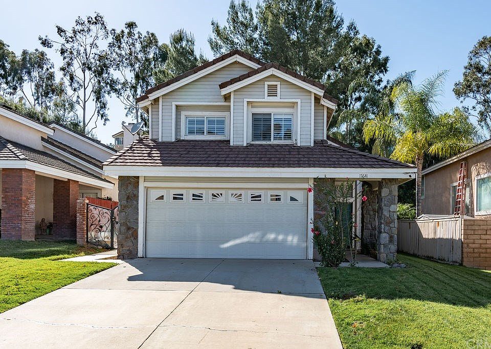 Welcome to beautiful Lake Hills! This move-in ready 3 bed, 2.5 bath home with a pool is located in a fantastic neighborhood on a quiet cul-de-sac. The downstairs interior boasts double entry front doors, vaulted ceilings, plantation shutters throughout, dual-sided fireplace in the living and family room, a bay window in the kitchen and French doors opening to the back yard. Each full bath has been upgraded with tile showers featuring mosaic tile inlays. The master bedroom invites you with a double-door entry leading to a large bedroom, walk-in and secondary closet and a bathroom with dual sinks. The attached 2-car garage features a workbench and cabinets. The large backyard boasts ample privacy and completes the home with an upgraded Pebble-Tec pool, spa and custom wrought iron rear and side gates. Located close to schools with easy access to the 91 FWY.