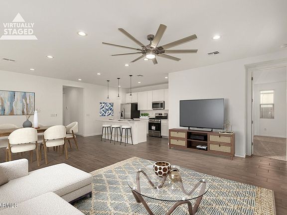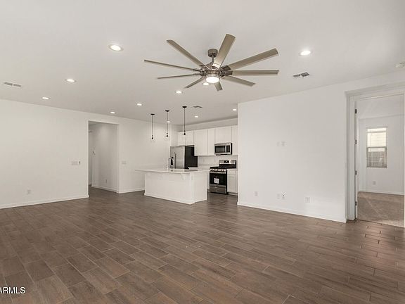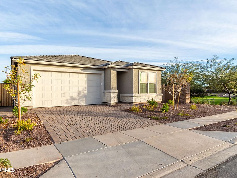 Introducing a brand-new Larimar model in the highly desirable Desert Oasis community in Surprise, AZ where modern style meets everyday convenience. This thoughtfully designed 3-bedroom, 2-bath home with a flex room offers an open, airy floorplan featuring white shaker cabinets, marble-style countertops, designer pendant lighting, and a spacious island with breakfast bar, all accented by warm wood-look tile flooring. A wide double slider opens to the covered patio, seamlessly extending your indoor-outdoor living. The primary suite is split for privacy, complete with a walk-in closet, dual sinks, and a sleek walk-in shower. Situated on a corner lot next to a green park, this home enjoys added space and peaceful views. Desert Oasis delivers an active, family-friendly lifestyle with community pools, splash pads, playgrounds, walking paths, sports courts, and even an on-site elementary school, all near mountain views, trails, shopping at Mountainside Crossing, and entertainment at Surprise Stadium. Turf and desert landscaping will be added (tenant may need to coordinate with landscapers). Fantastic freeway access, plus nearby shops and restaurants, make this location hard to beat.