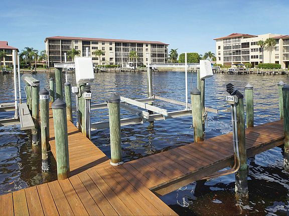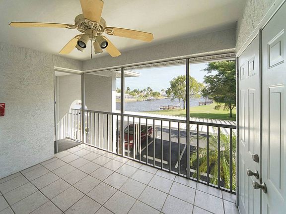 Ideal condo for the boater who wants a deeded slip/boat lift with quick direct access and basin waterfront views. A 10k lb boat lift is included and you're just a few doors away from the river, and to all of your boating fun. This 1,384 sq ft, 2 bed + den, 2nd floor unit has cathedral ceilings, eat in kitchen, both front and rear lanais with basin and river views. Covered parking. This small complex has a community pool and is close to downtown Cape Coral restaurants and night life.