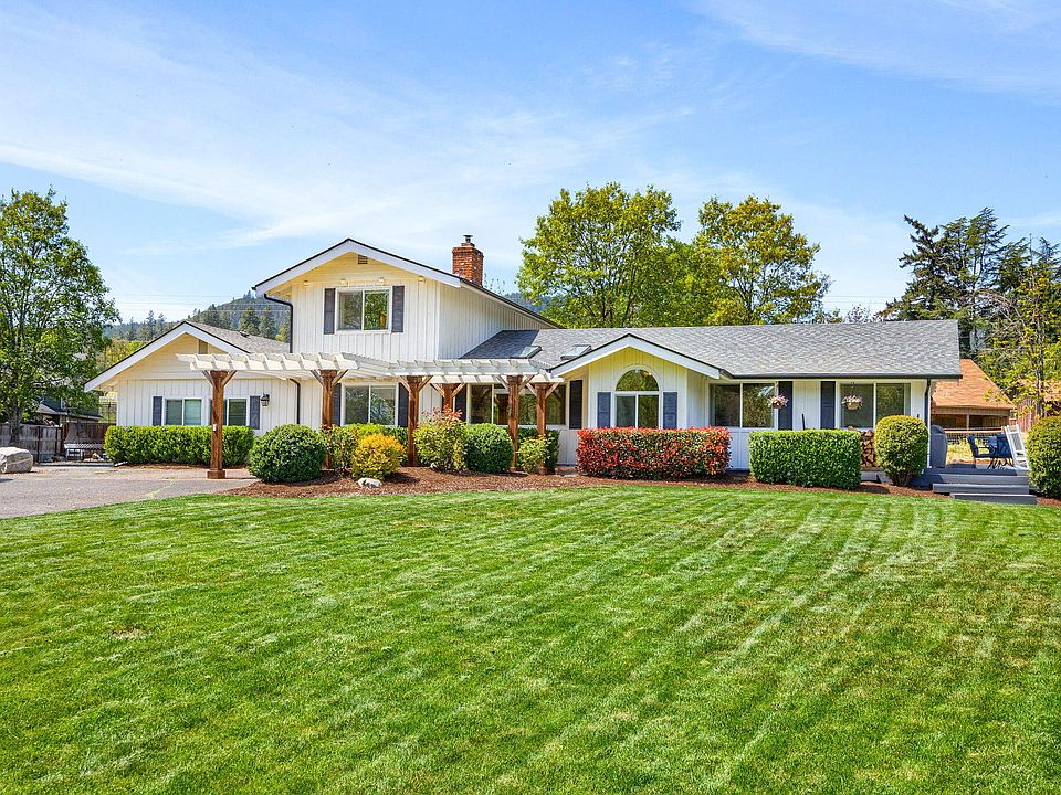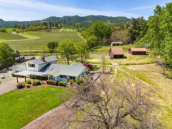 When you think of location, this is it! Sitting on 2+ irrigated acres is a wonderful farm home updated in 2017 with new roof, windows, paint inside and out, new light fixtures, new water heater, hvac, beautiful flooring, tile and carpeting. Great floor plan with living room featuring vaulted ceilings and wood insert fireplace. Formal dining room, breakfast nook and a wonderful kitchen with quartz countertops, island, Viking 6 burner gas range, pot filler, wine fridge, dishwasher and plenty of beautiful cabinetry for all your kitchen needs. The main level primary suite features tiled walk in shower and double sink vanity. Another bedroom, office and laundry/mud room with sink on the main level. Finished basement makes a great media/family room. Upstairs features full bathroom and two additional bedrooms. Attached 2.5 car garage with workshop space. Plus there are two vintage barns! All located just minutes from downtown Jacksonville and all it offers! Access from Old Military Rd. too!
